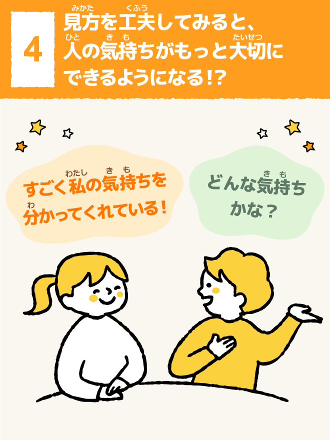 - 困っている人の発言や行動など、見えている問題だけで判断せずに、視点を切り替えて、相手の立場に立って考えてみること